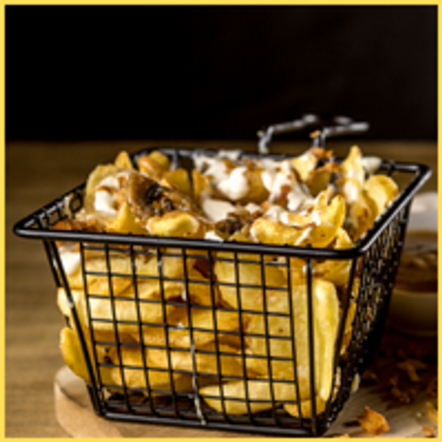 Dippers, sauce Frenchy, champignons, confit d'oignons, coriandre & oignons frits.