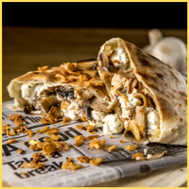 Galette de pomme de terre, sauce Frenchy, poulet mariné, oignons frits, champignons & Boursin.