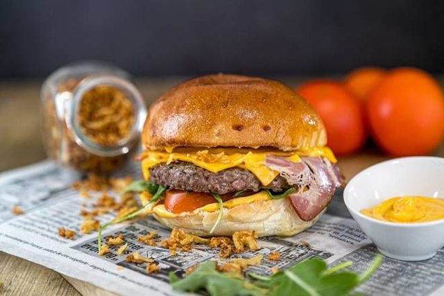 Pain brioché, steak (125g), poitrine de veau, cheddar, salade, tomates, oignons frits & sauce Burger.