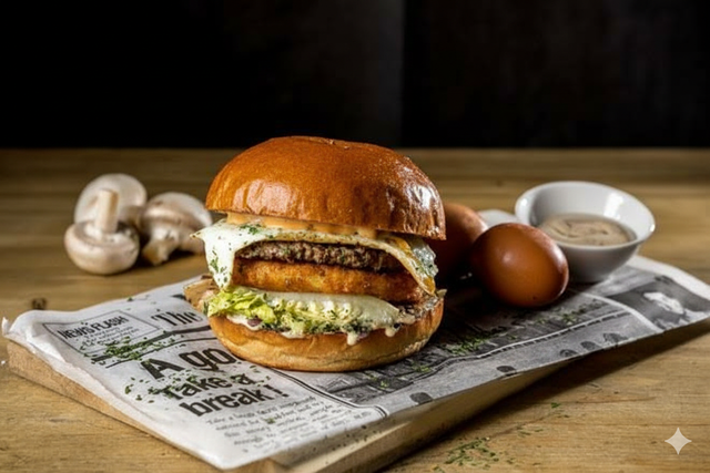 Pain Brioché, steak (125g), œuf, galette de pomme de terre, salade, oignons rouges, champignons, persil, Boursin & sauce au poivre.