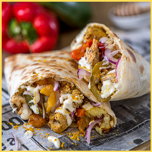 Galette de pomme de terre, sauce Frenchy, poulet mariné, oignons rouges, poivrons, miel & sauce Oignons curry.